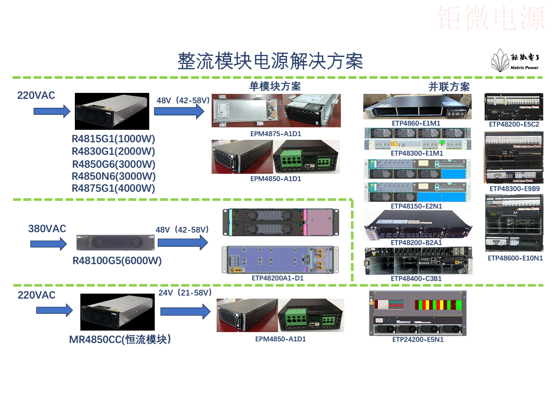整流模塊電源解決方案包括單模塊方案和并聯(lián)模塊方案,將整流模塊R4815G1、R4830G1、R4850G6、R4850N6、R4875G1、R48100G5和MR4850CC通過我公司設(shè)計(jì)的插匡系統(tǒng)實(shí)現(xiàn)單個模塊使用和多個模塊并聯(lián)使用。